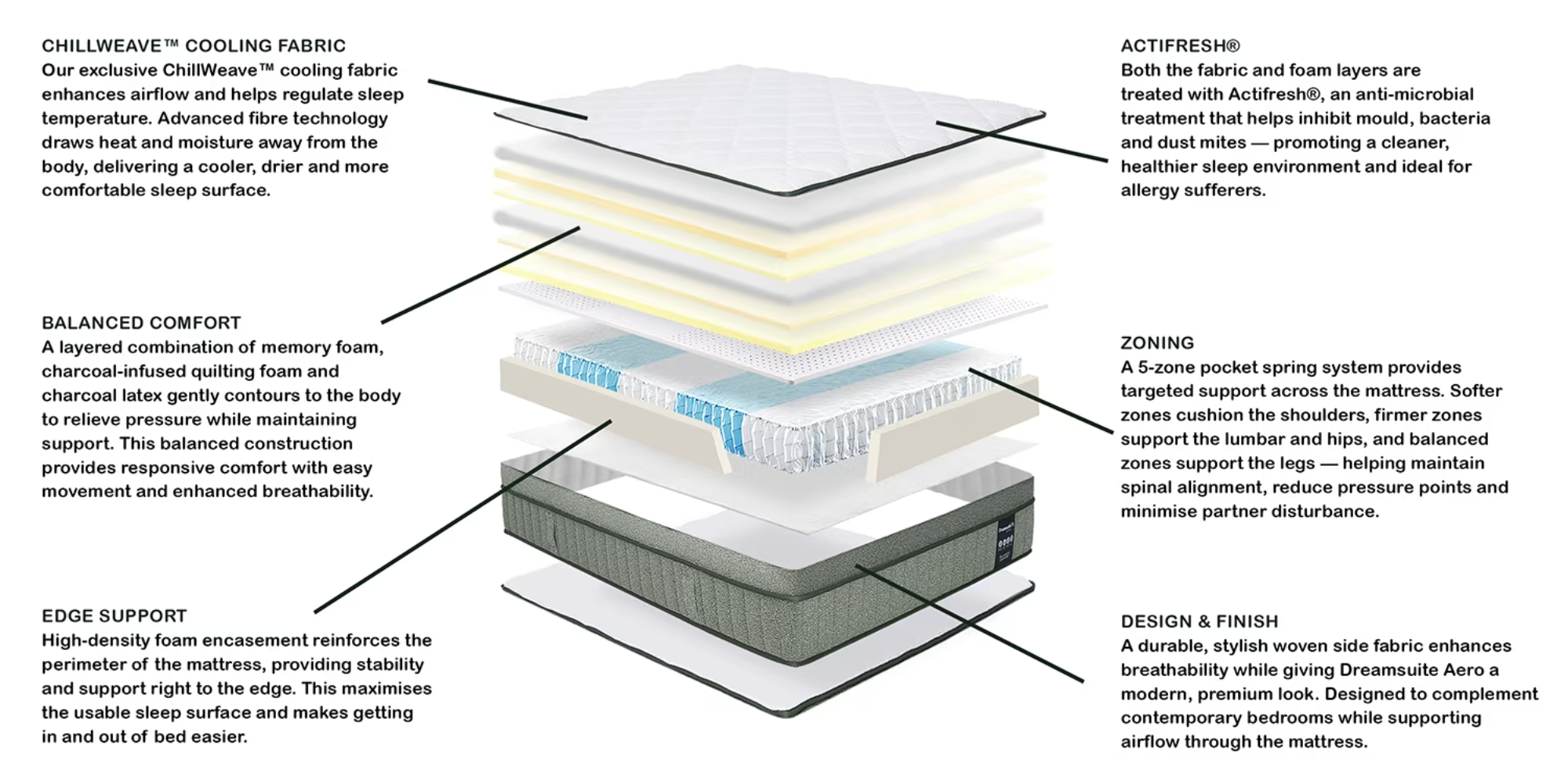 Positioned as a more advanced option within the Dreamsuite range, the Aero features cooling fabric, memory foam, latex, and zoned pocket springs.